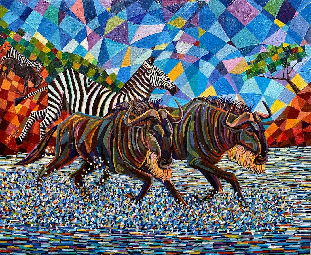 This piece was created at the Uweza Art Gallery by a youth artist living in Nairobi, Kenya. 60% of the proceeds of this sale will go to the artist and 40% will go toward the operations of our art gallery, which provides opportunities for creative expression and development of artistic talent for children and youth living in Kibera.