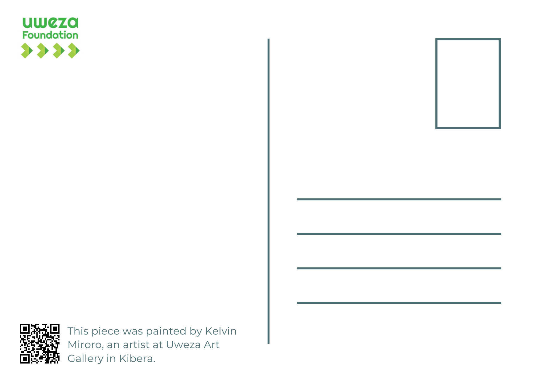 This piece was created at the Uweza Art Gallery by a youth artist living in the Kibera slum of Nairobi Kenya. It was then scanned and is as a high quality A6 postcard. 60% of the proceeds of this sale will go to the artist and 40% will go toward the operations of our art gallery, which provides opportunities for creative expression and development of artistic talent for children and youth living in Kibera.